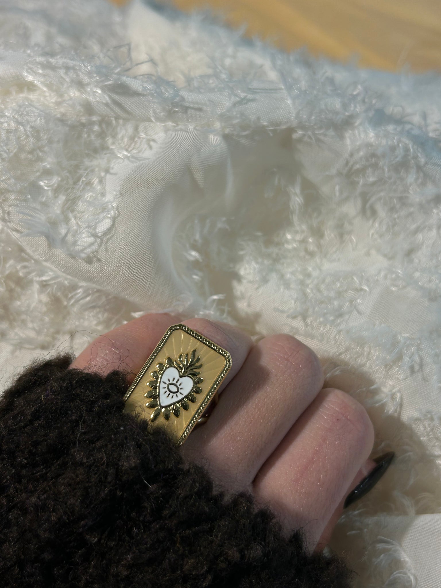 Cette bague en acier inoxydable se distingue par son design fort et symbolique. Son plateau rectangulaire doré met en valeur un cœur sacré émaillé, délicatement entouré de rayons solaires, pour un bijou à la fois tendance et chargé de caractère.