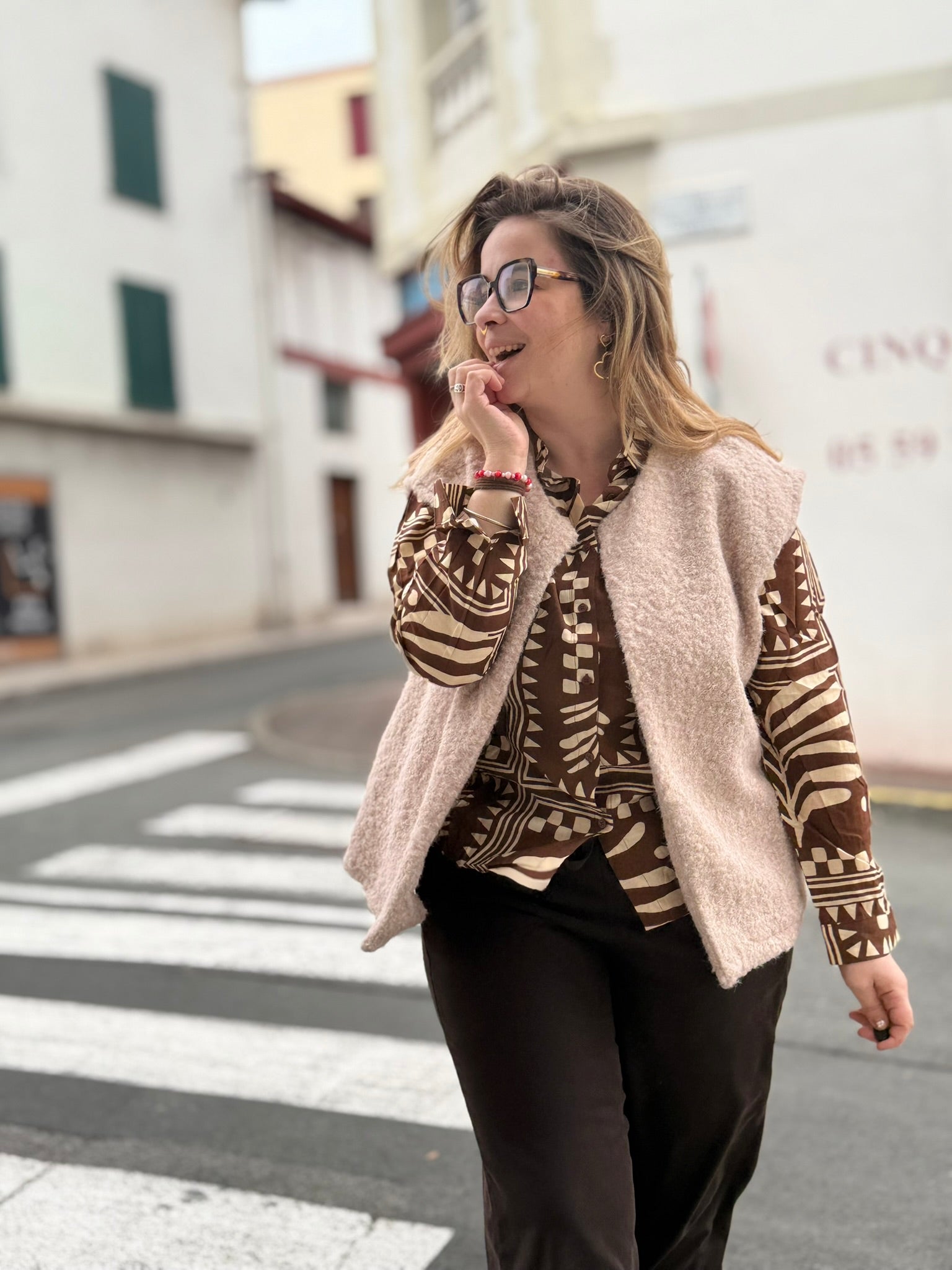 Adopte une allure audacieuse et tendance avec la chemise "Tahia", une pièce forte au style graphique ethnique. Son imprimé géométrique beige sur fond chocolat capte la lumière et booste instantanément tes looks les plus simples. Fluide, douce et agréable à porter grâce à sa matière en viscose, elle t’accompagne au bureau, en sortie ou même pour chiller avec élégance.