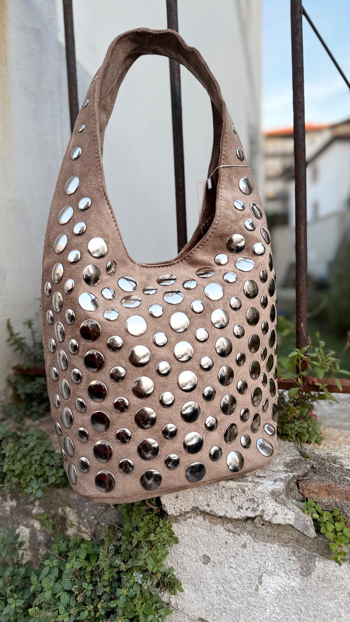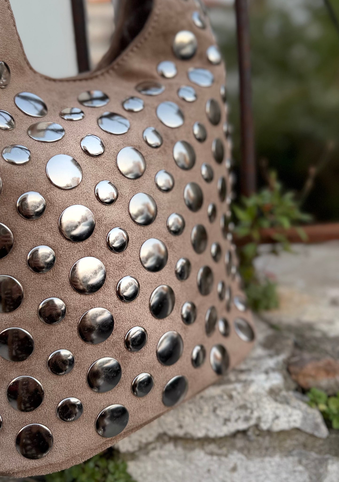 🤍 Sac seau taupe à clous – Le plus sage (mais pas trop)