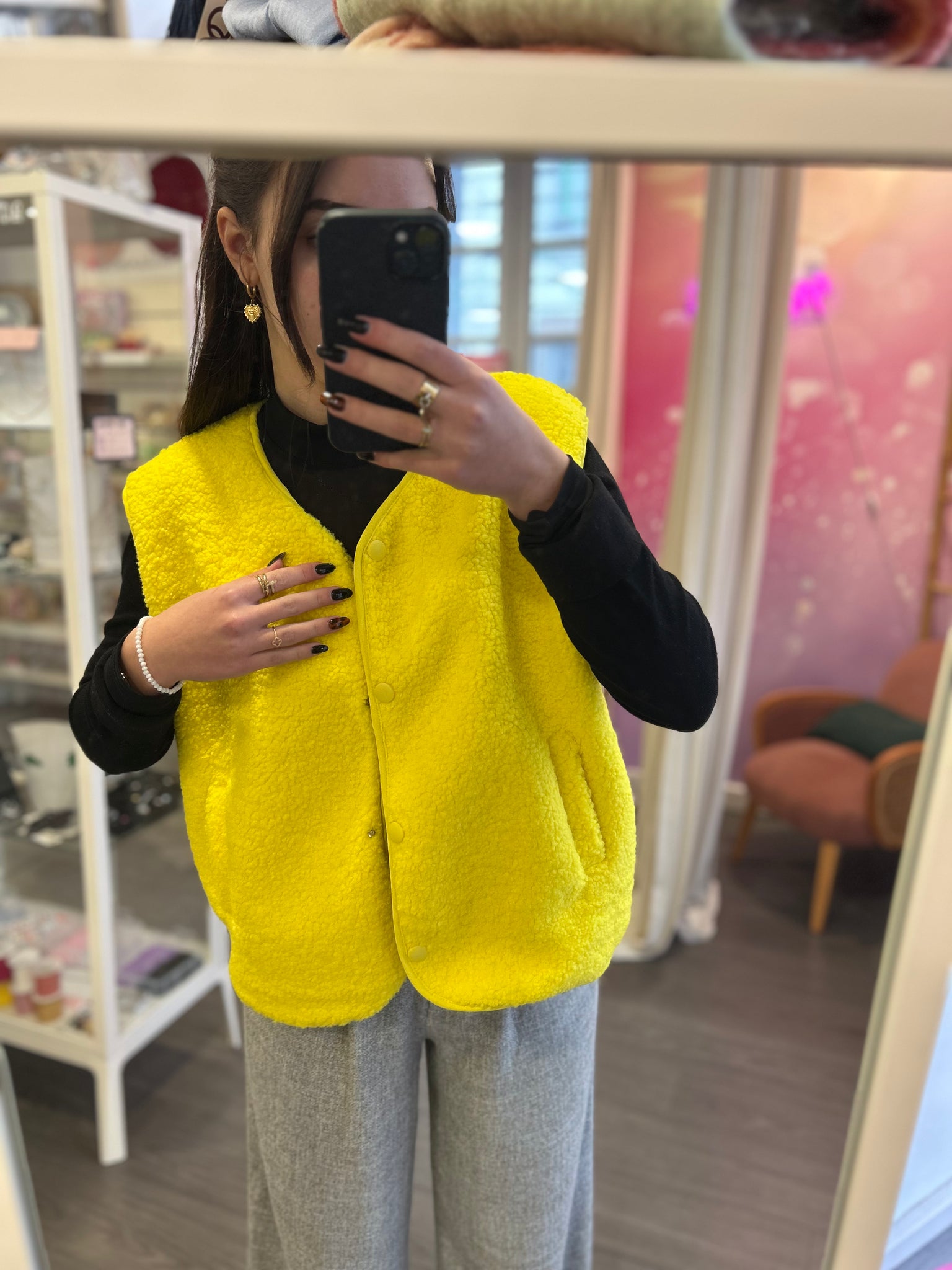 Cette veste sans manches est la pièce parfaite pour réchauffer une tenue tout en restant tendance. Son effet moumoute apporte un aspect cosy et moderne, idéal à superposer sur un pull, une maille ou une blouse. Pratique et stylée, elle se ferme par boutons pression et dispose de poches sur le devant.