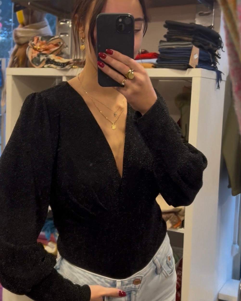 Ce body pailleté est la pièce idéale pour illuminer vos tenues. À la fois chic et féminin, il séduit par son décolleté en V flatteur et sa matière scintillante. Parfait pour une soirée, un événement ou pour apporter une touche glamour à un look du quotidien.