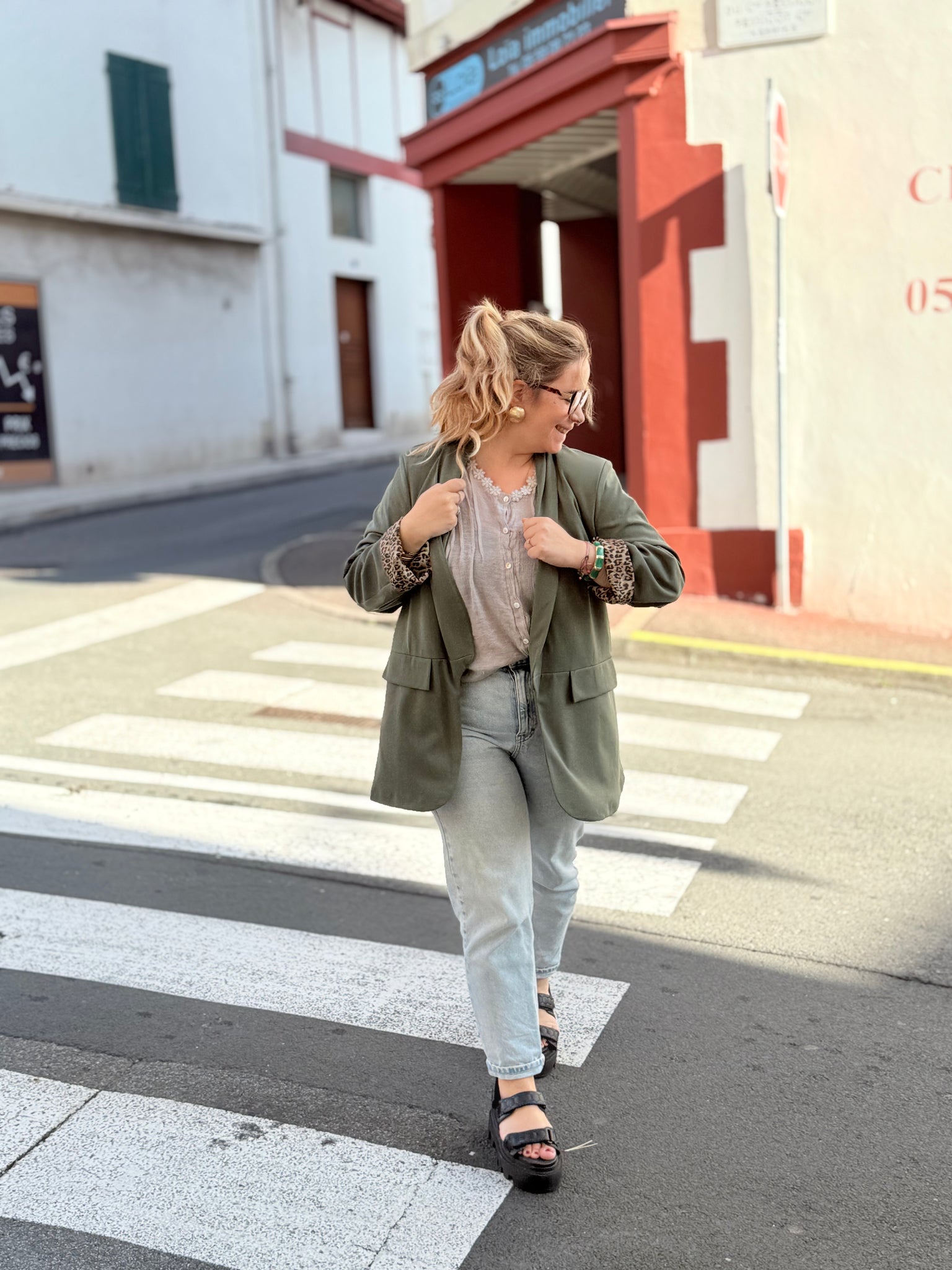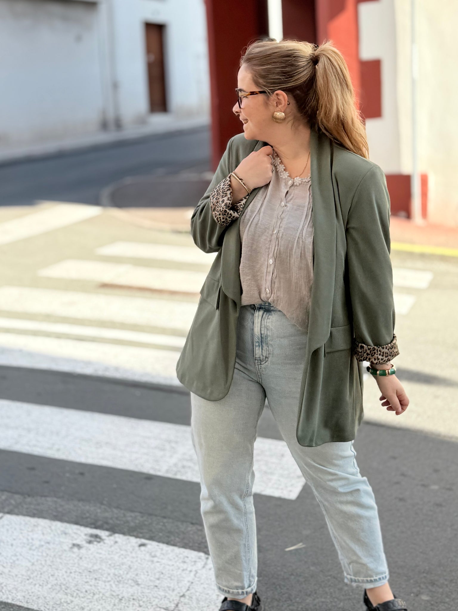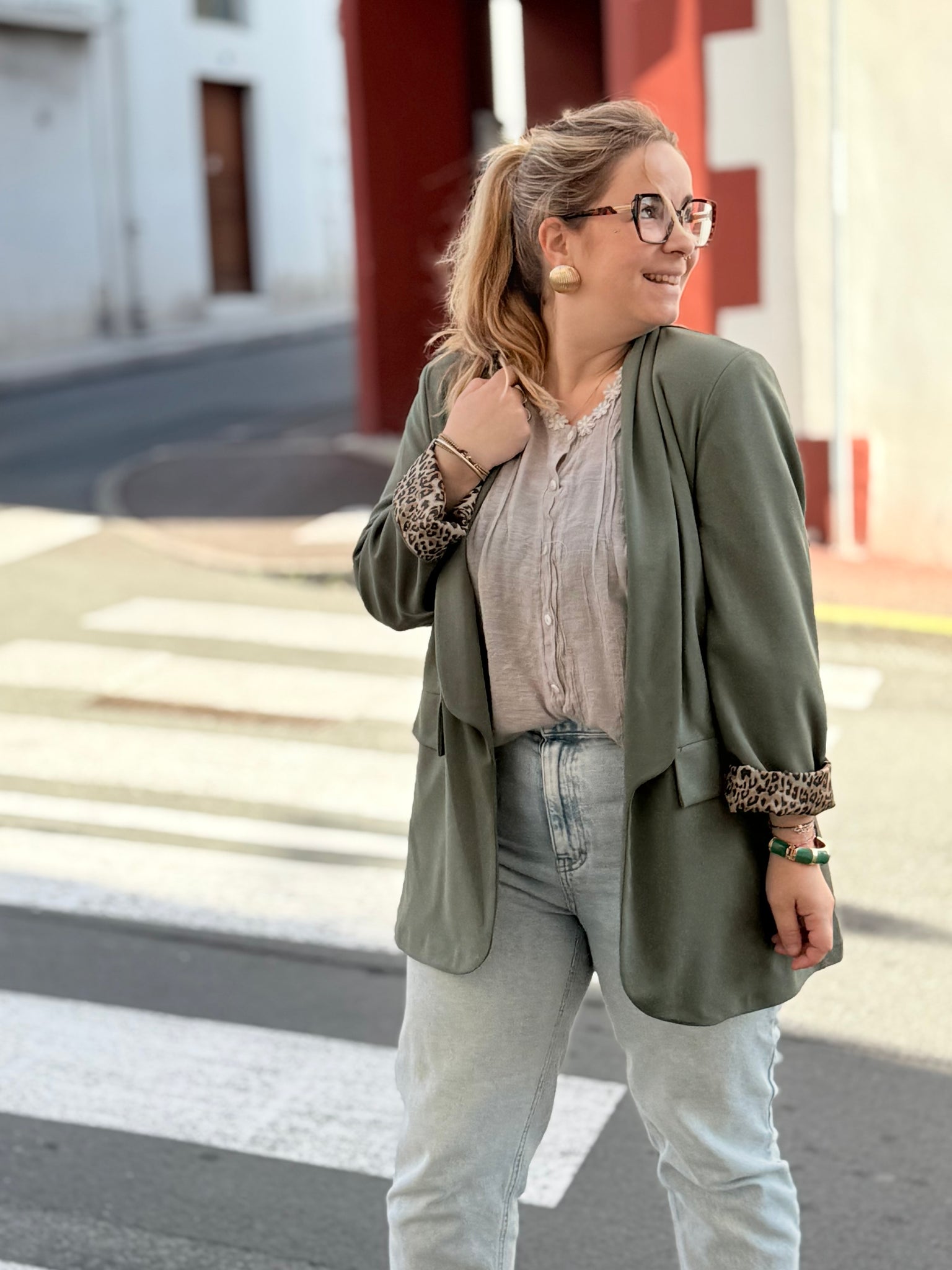 🌿 Blazer fluide kaki intérieur léopard – Italie