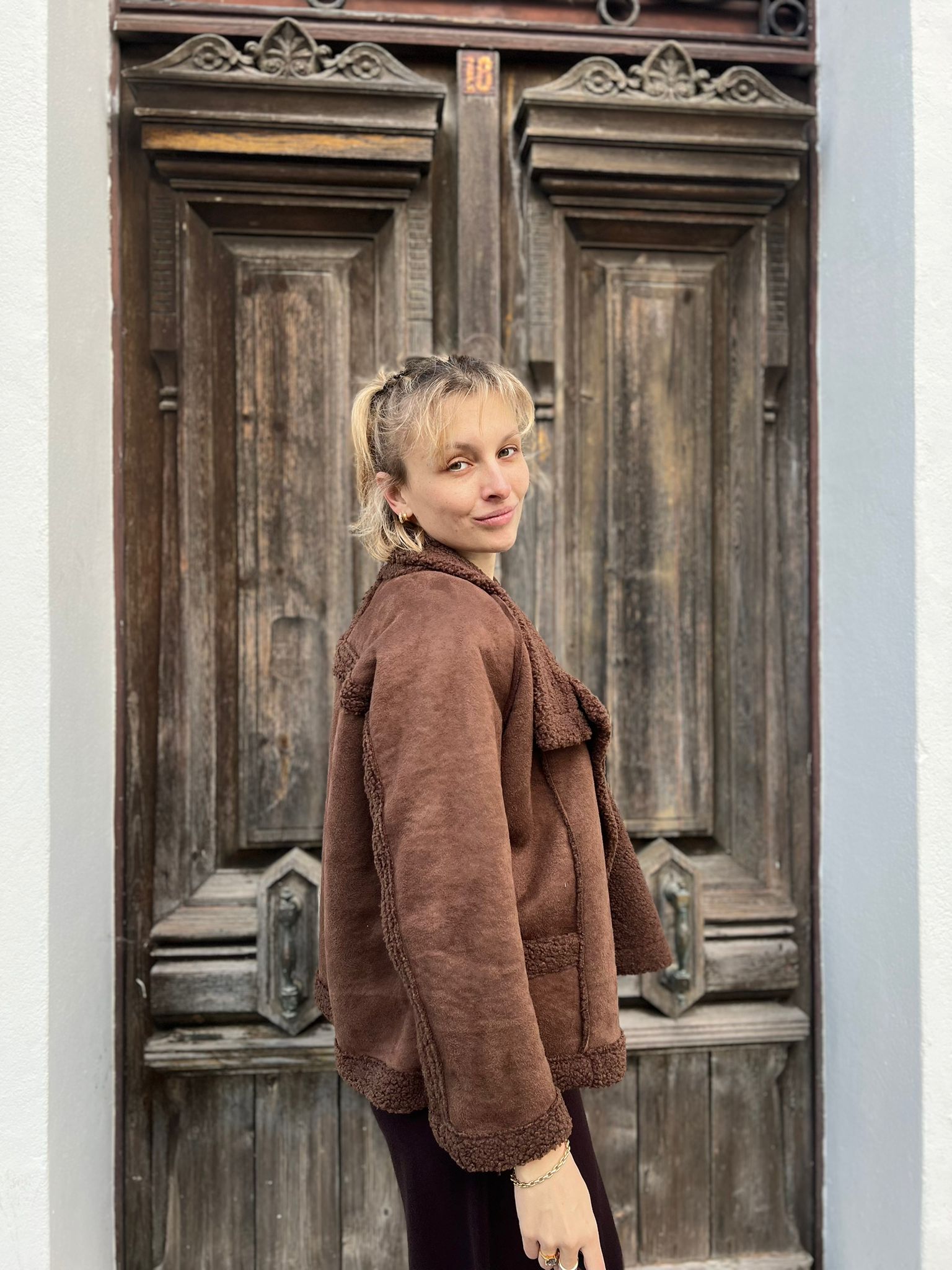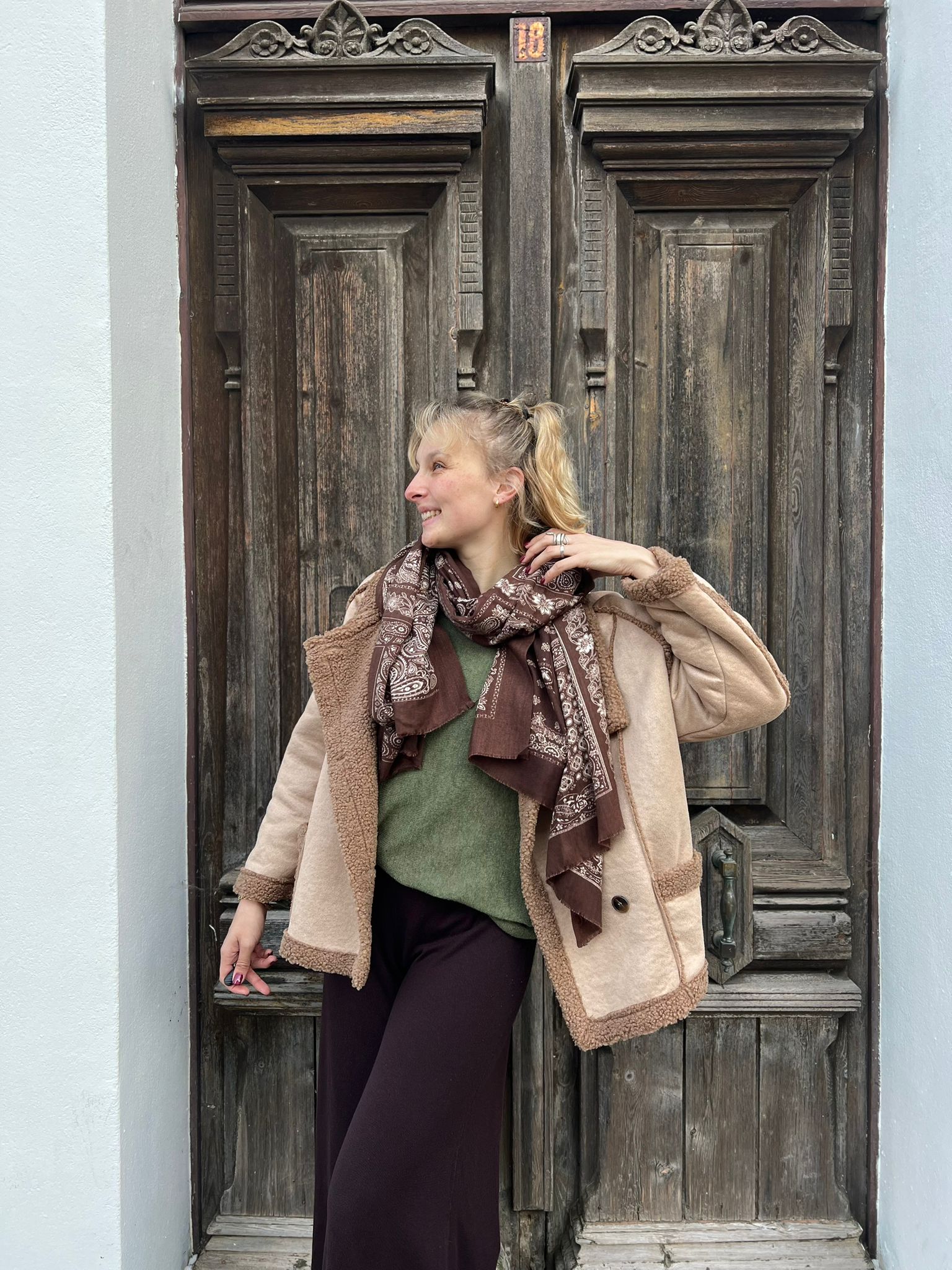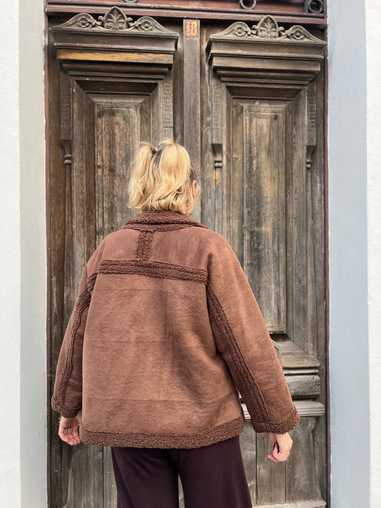 Fabriqué en Italie, ce manteau en sherpa beige et chocolat est la pièce cocooning indispensable de la saison. Sa texture douce et moelleuse rappelle la laine de mouton, offrant chaleur et bien-être dès les premiers froids. Sa coupe droite légèrement oversize te permet de superposer facilement un pull ou une écharpe pour un look à la fois stylé et confortable.