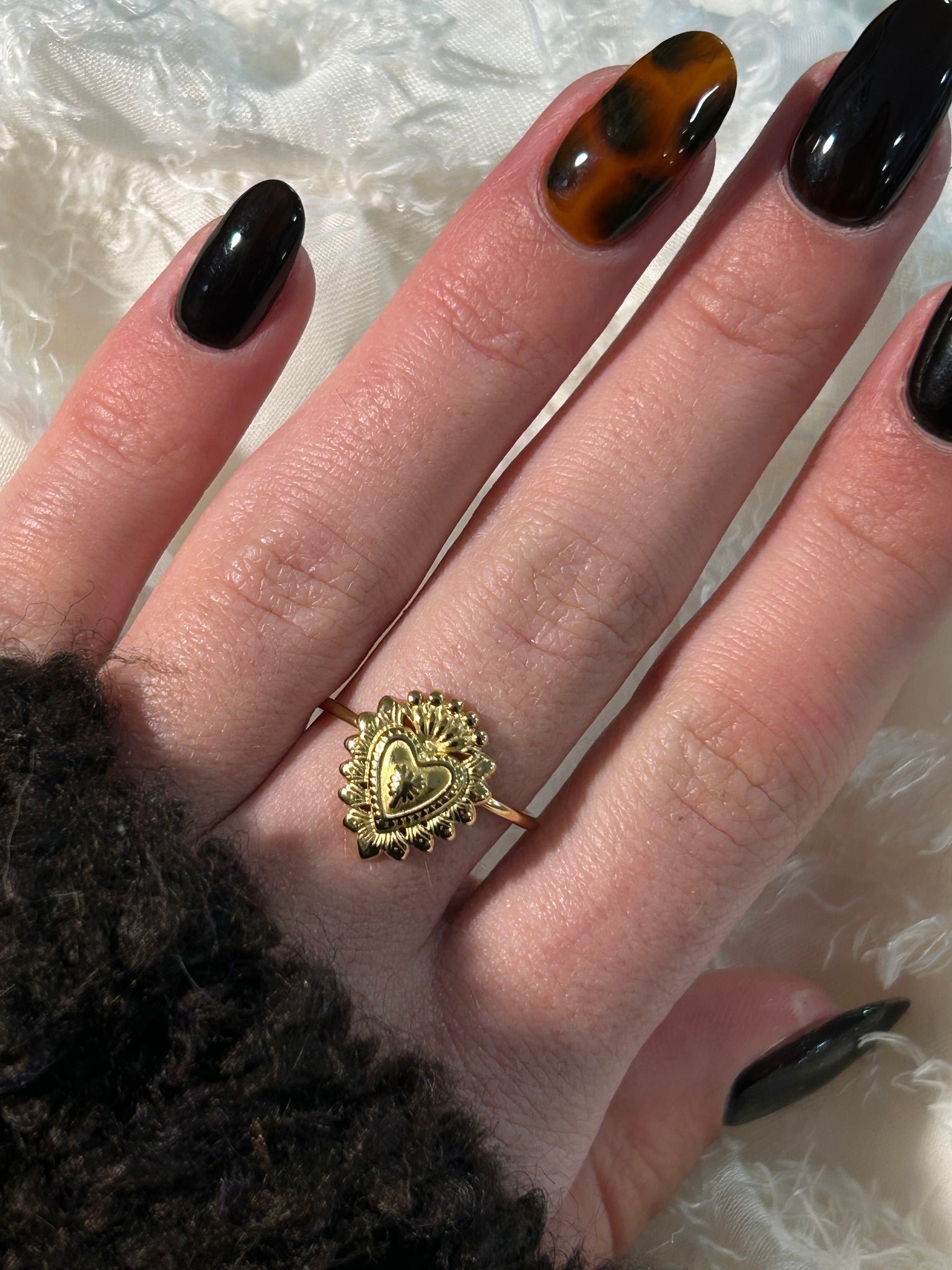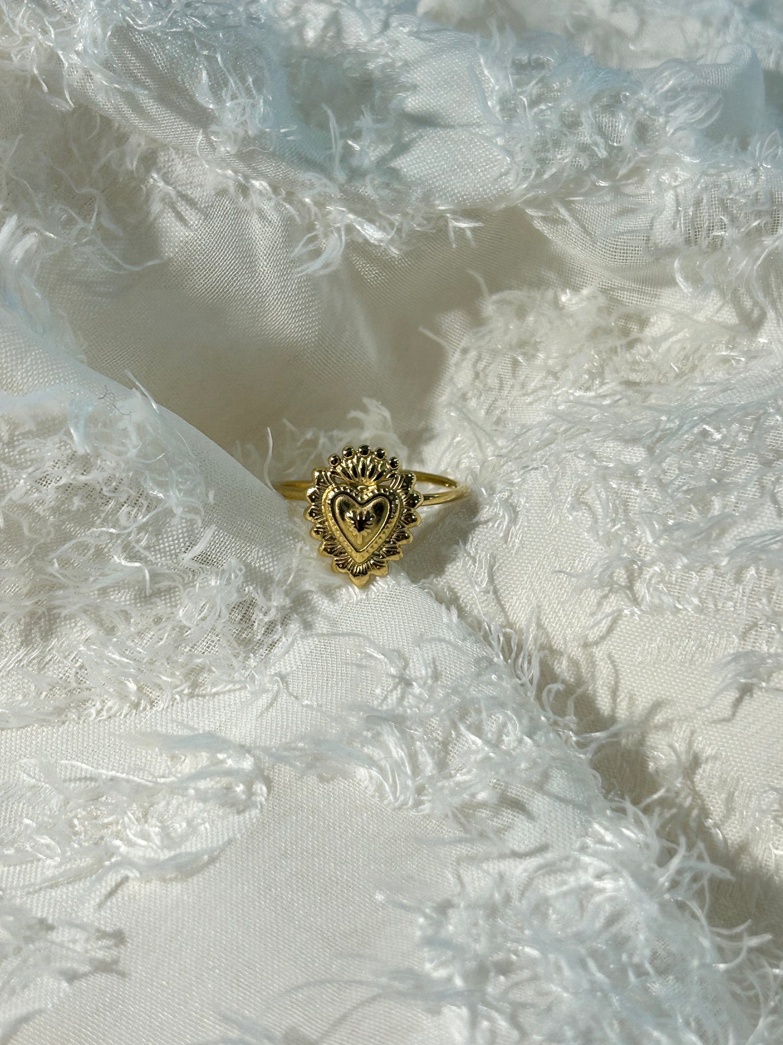 Délicate et pleine de charme, cette bague en acier inoxydable met en lumière un cœur sacré doré, finement travaillé et entouré de détails rayonnants. Son design raffiné apporte une touche bohème et romantique, idéale pour sublimer la main au quotidien.