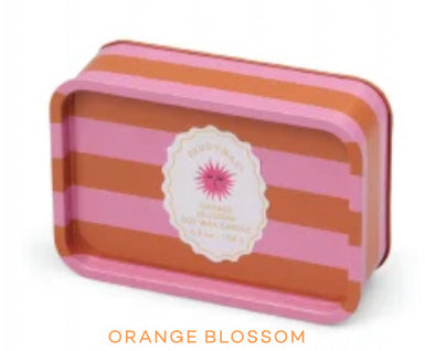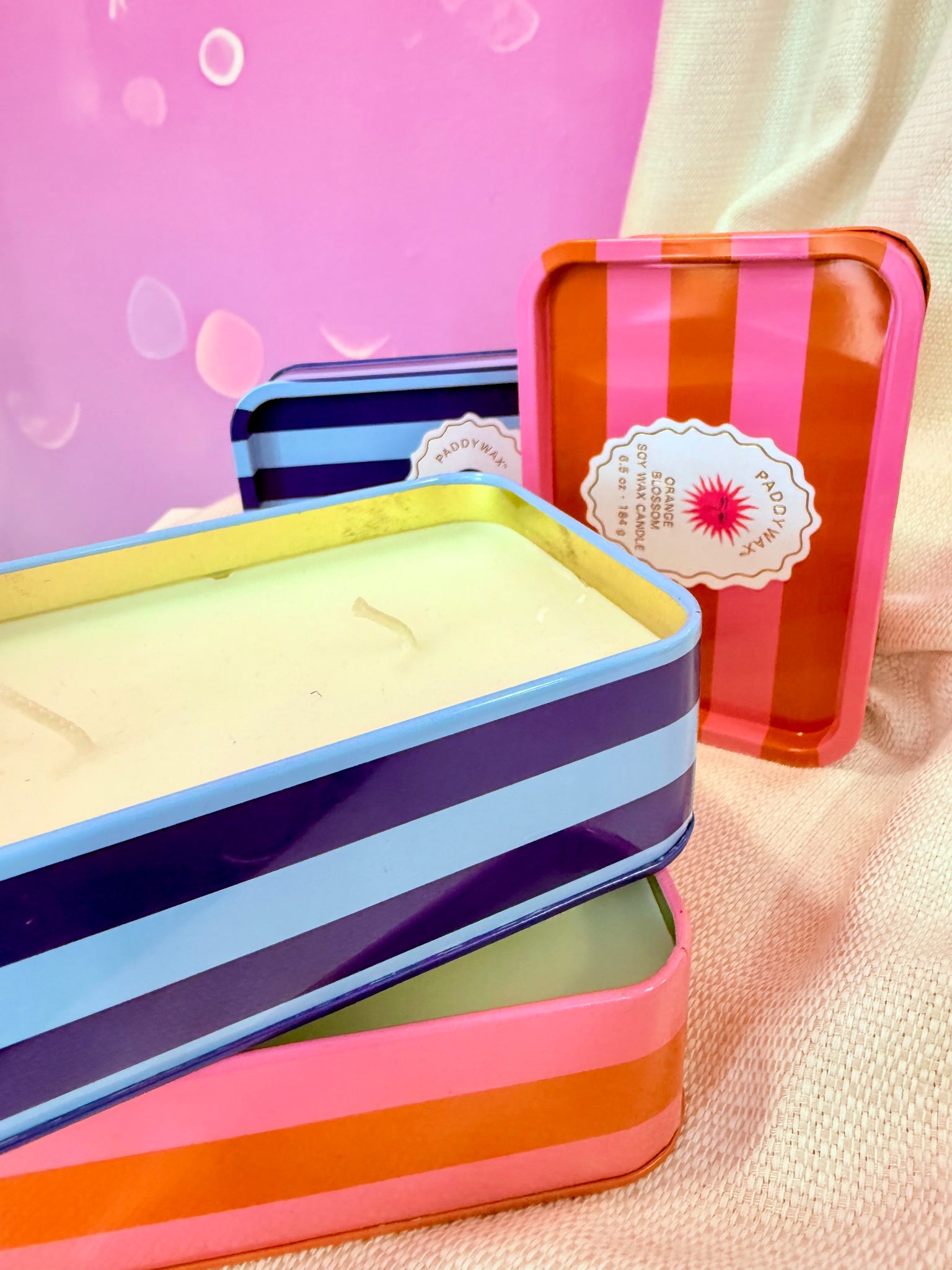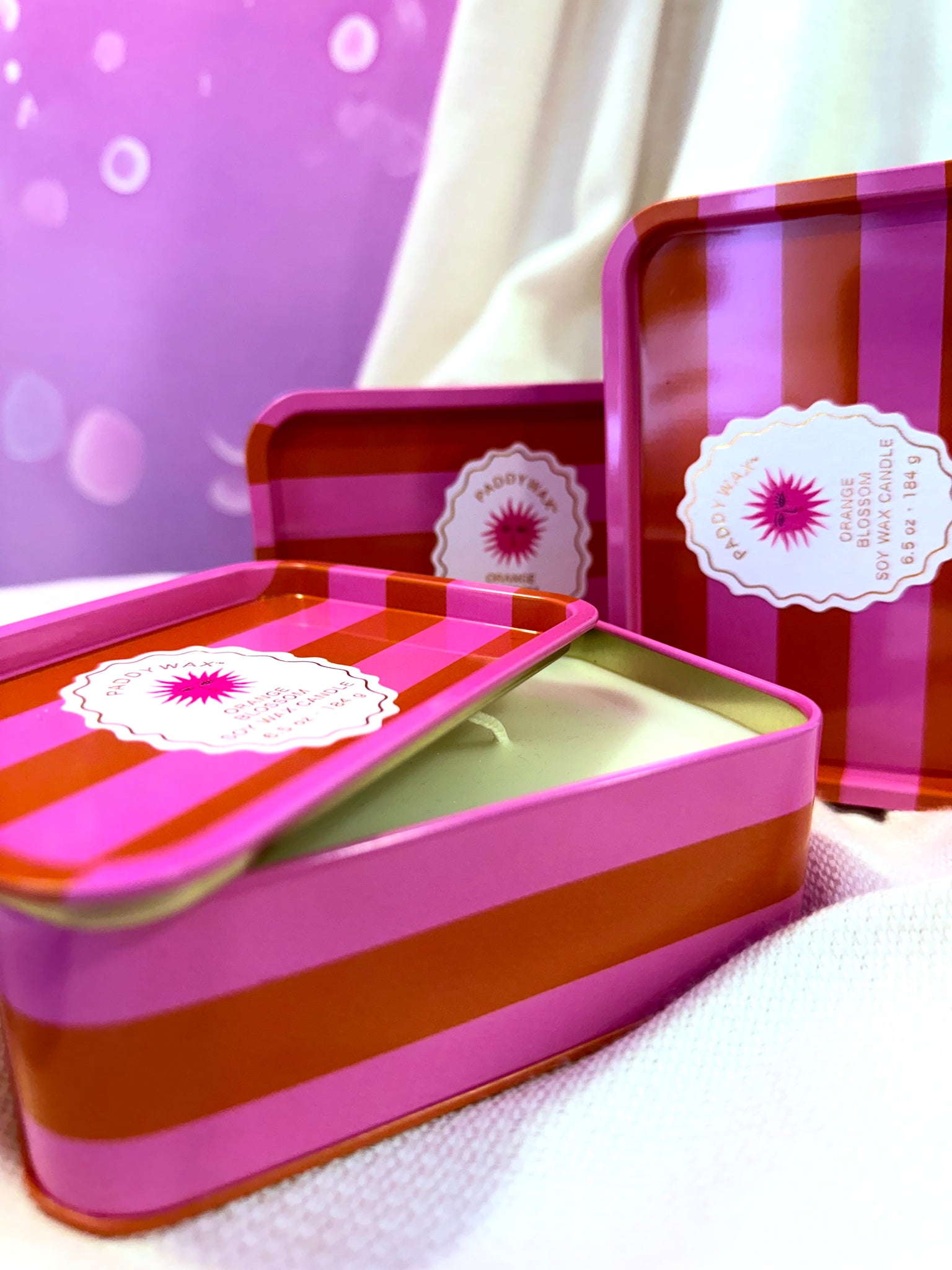 • Fond : musc blanc, muguet, bois de rose - Look : rayures rose & orange, couvercle assorti