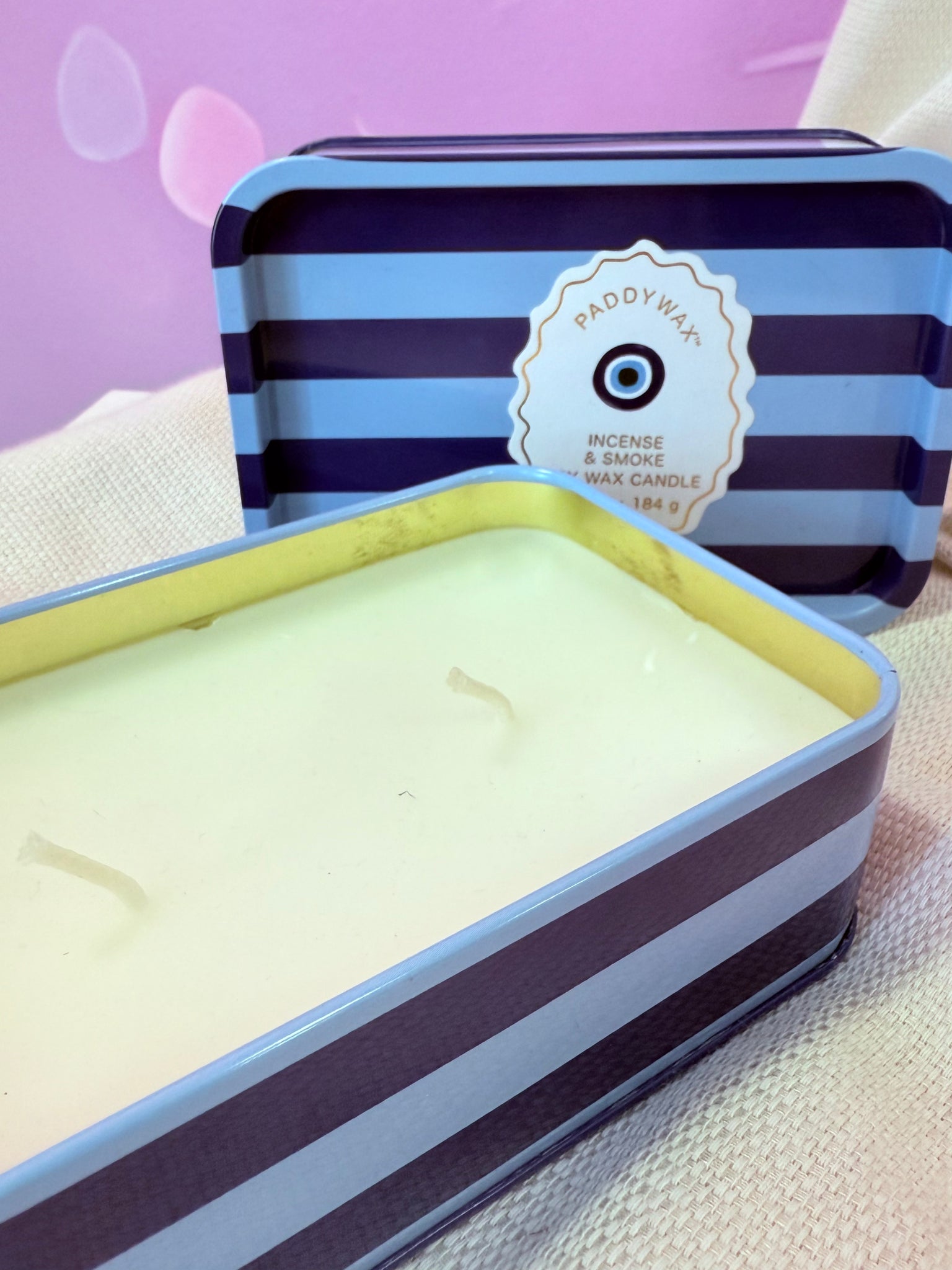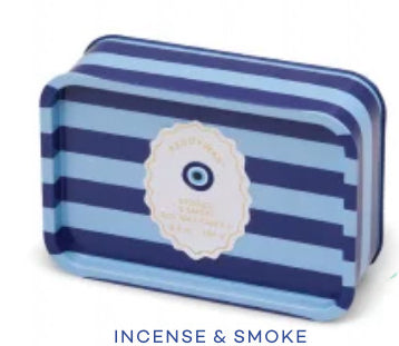 • Fond : encens, myrrhe, bois de cèdre - Look : rayures bleu marine & bleu ciel, couvercle assorti