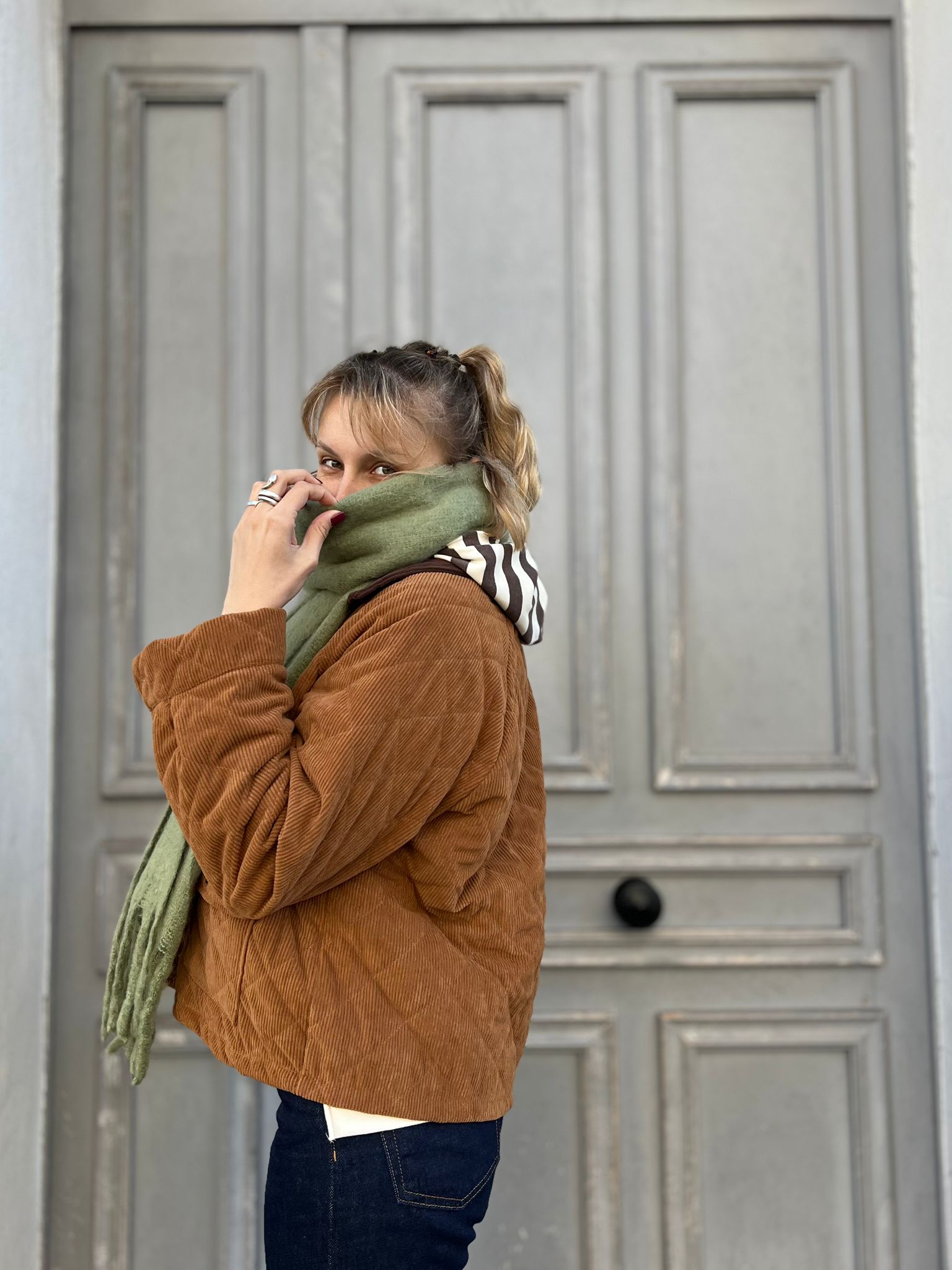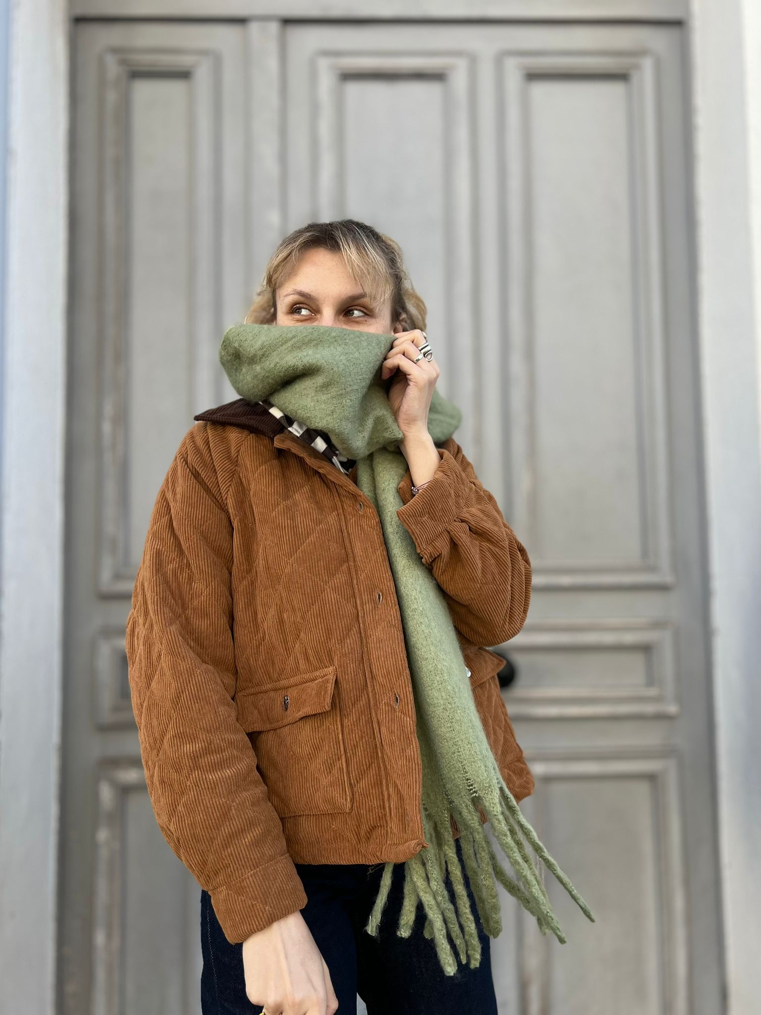 L’écharpe qu’on adore enfiler dès les premiers frimas 💚 ! Grande, épaisse et incroyablement douce, cette écharpe kaki enveloppe ton cou dans un cocon de chaleur et de style. Sa texture moelleuse et sa couleur intemporelle en font un accessoire parfait pour sublimer toutes tes tenues d’hiver — du manteau chic au blouson décontracté.