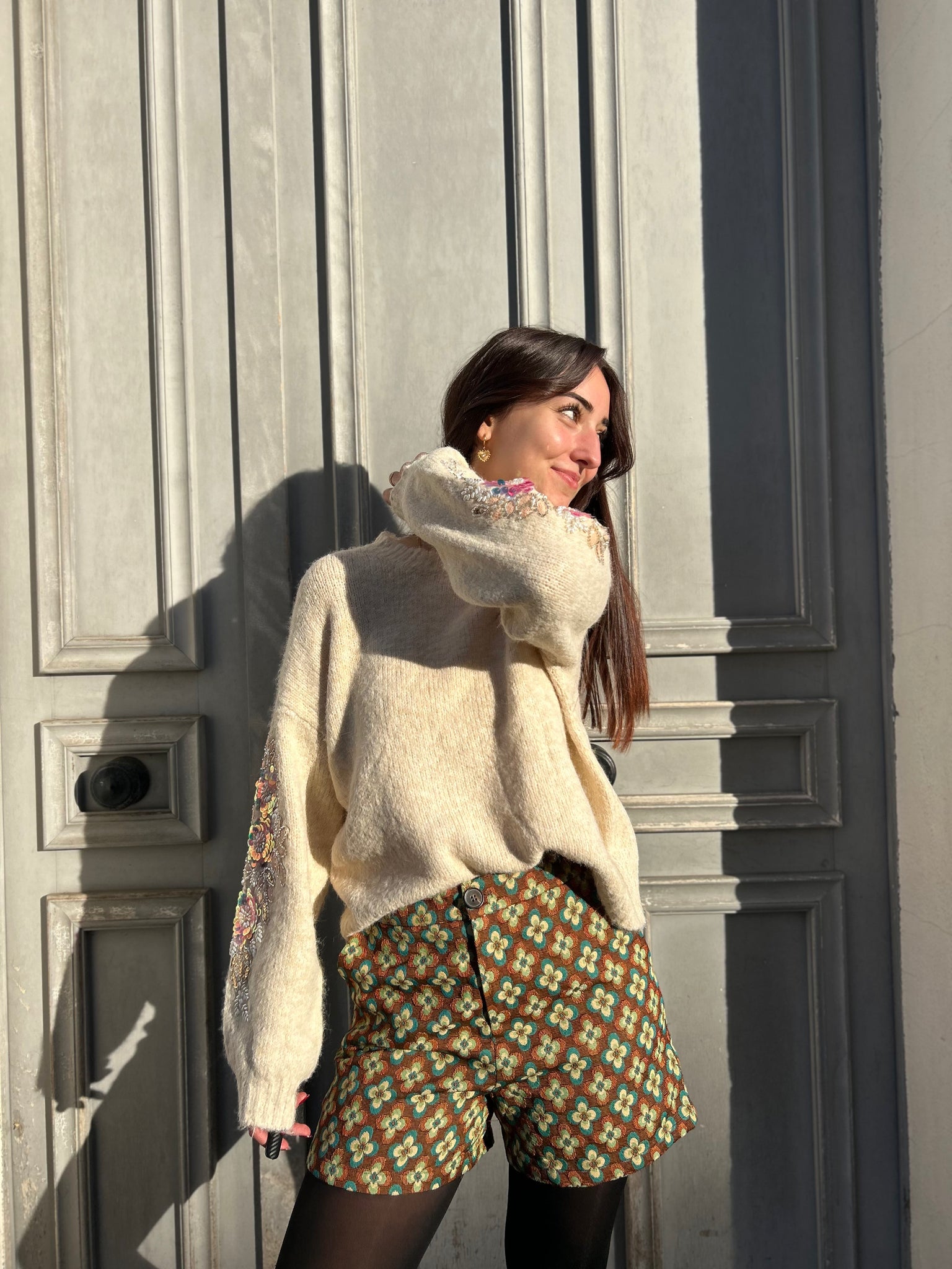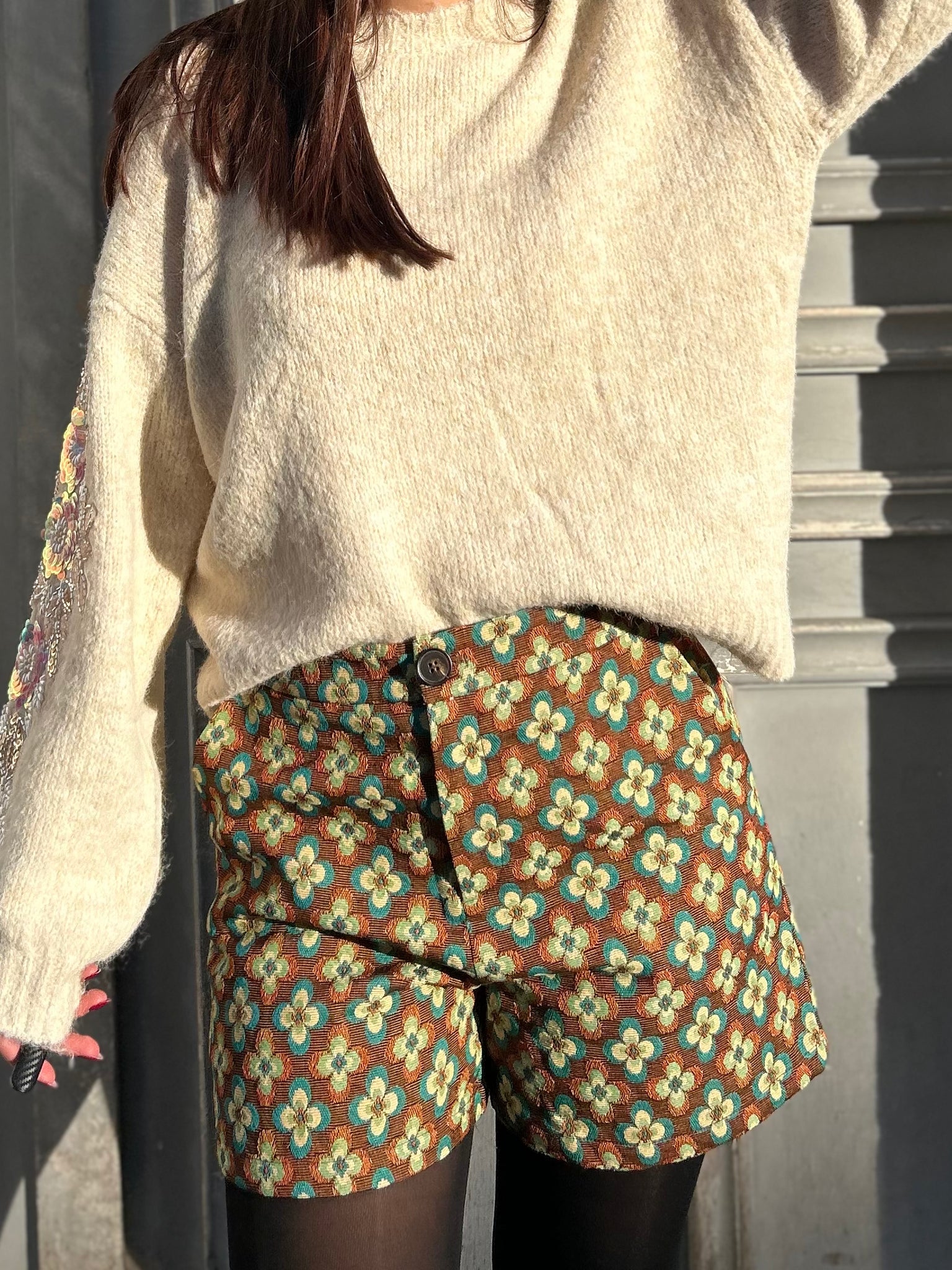 🎀 Laisse-toi séduire par ce short , une pièce forte qui apporte instantanément du style à n’importe quelle tenue. Son tissu épais et structuré met en valeur le motif rétro ultra tendance, mêlant des tons verts, dorés et marron pour un rendu chaleureux et lumineux.