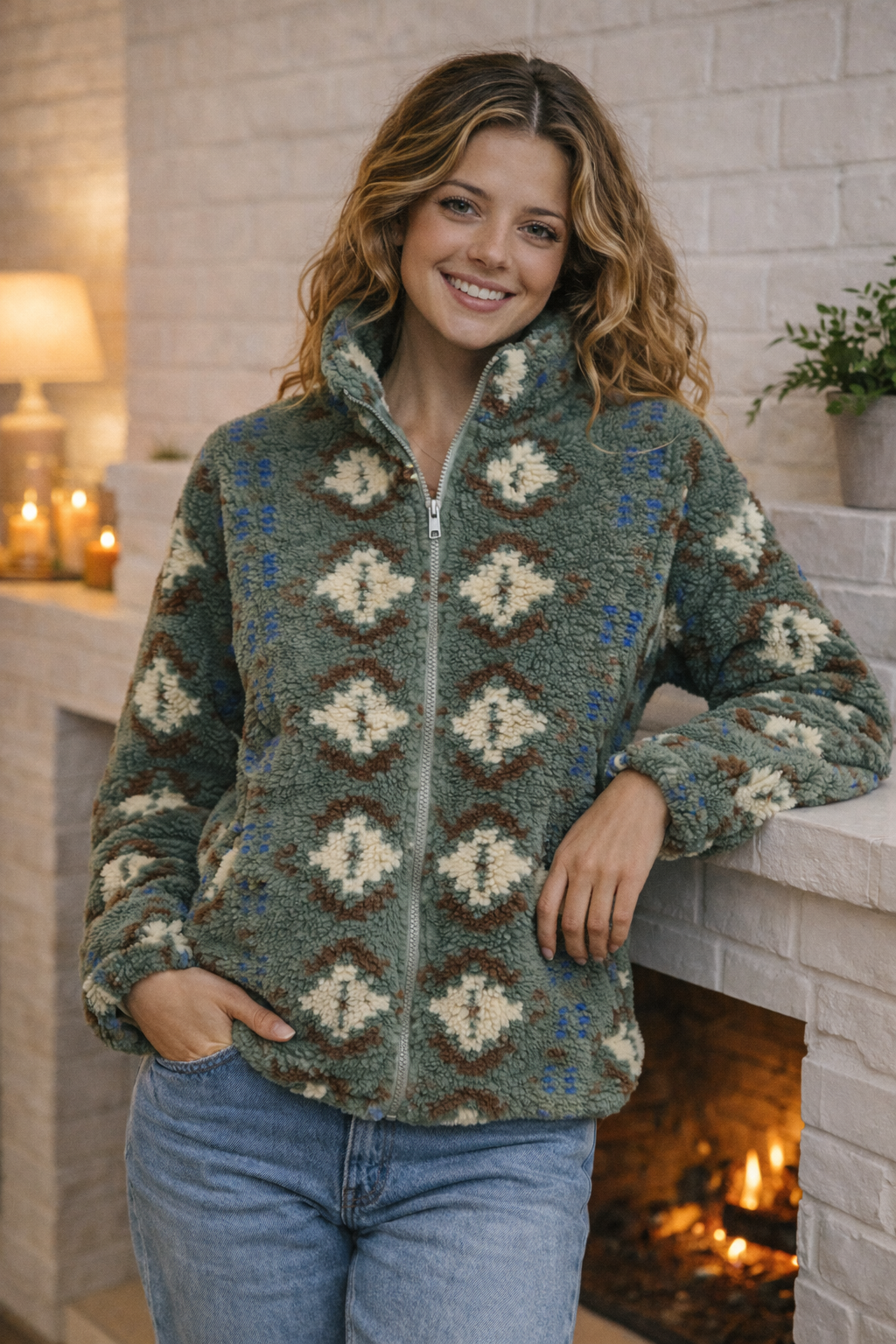 Ses motifs ethniques donnent du relief et du caractère, pendant que la matière Teddy Bear ultra douce t’enveloppe de chaleur.